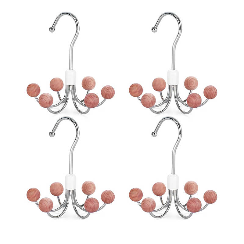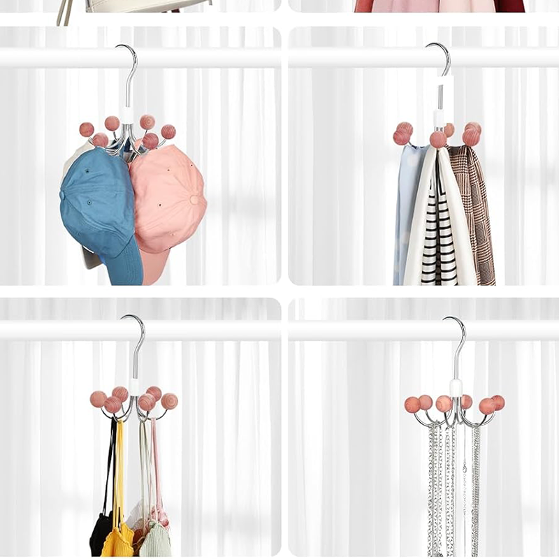 These are multi - hook rotary hangers. They feature a 360 - degree rotating design, allowing for easy access to hanging items from any angle. Equipped with multiple hooks (topped with small round beads for a decorative and smooth - touching effect), they can hold various items like bags, scarves, belts, and accessories, helping to organize and save space in closets or on hooks. The integrated curved hooks make hanging on rods or hooks convenient. Suitable for home use, they keep accessories neatly arranged and easily accessible, adding both functionality and a touch of style to storage.