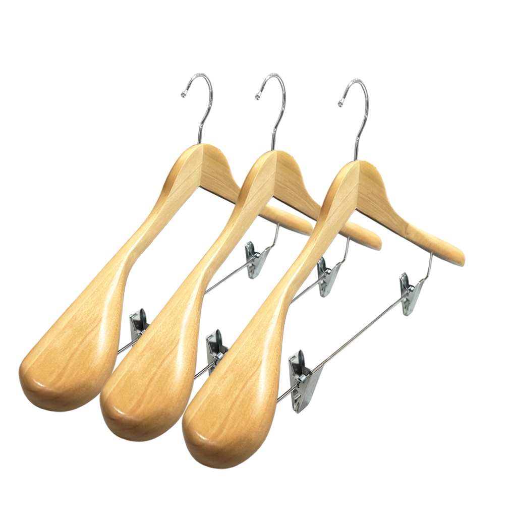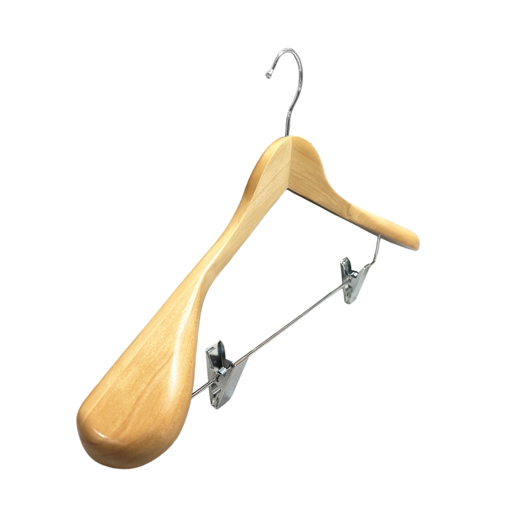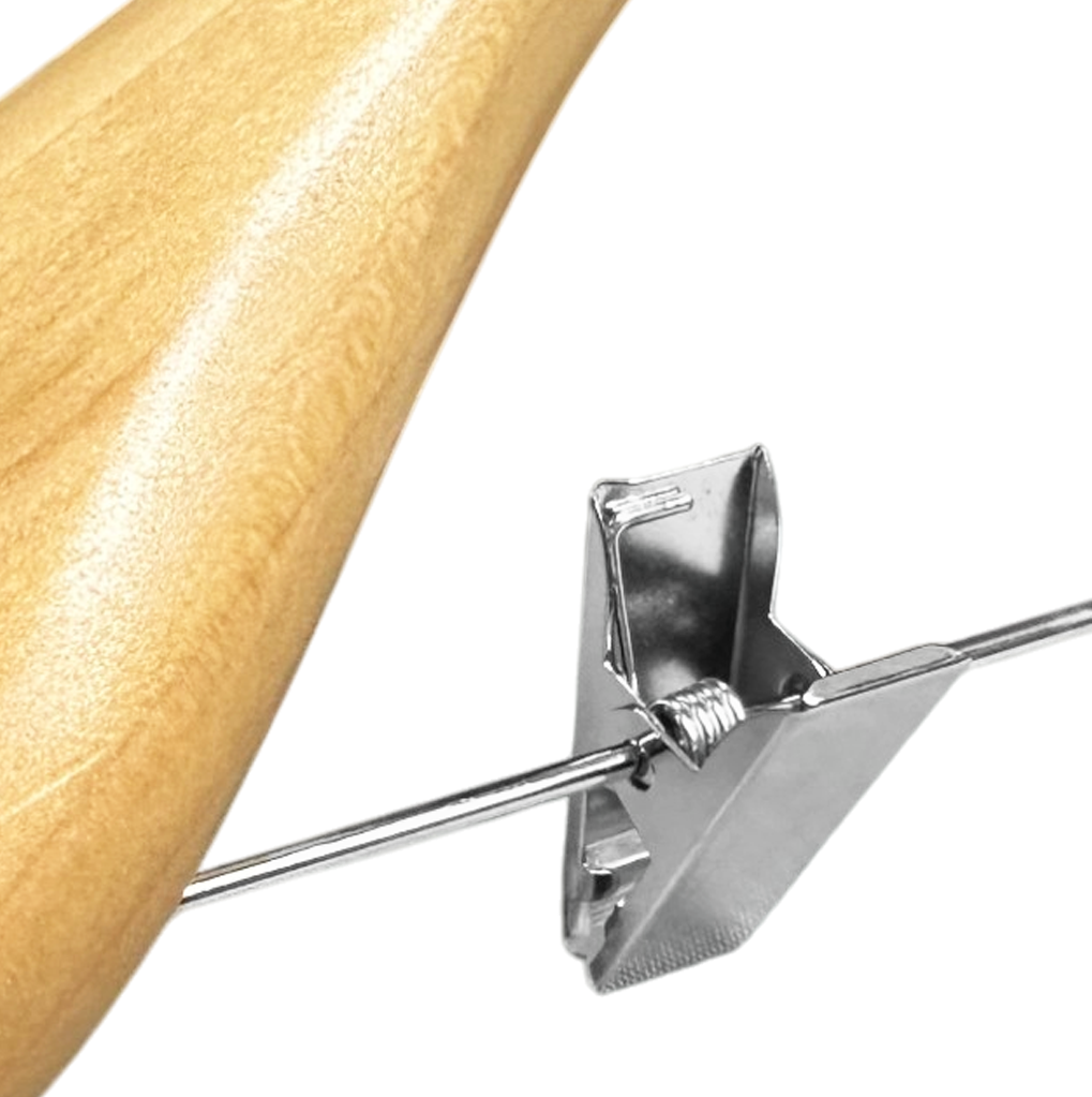 Chromed Adjustable Clips :wooden hanger with 2 adjustable metal clips to suit various size needs
