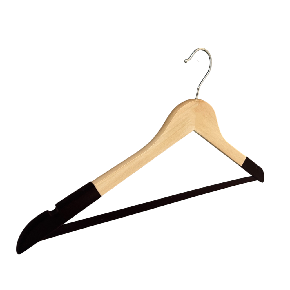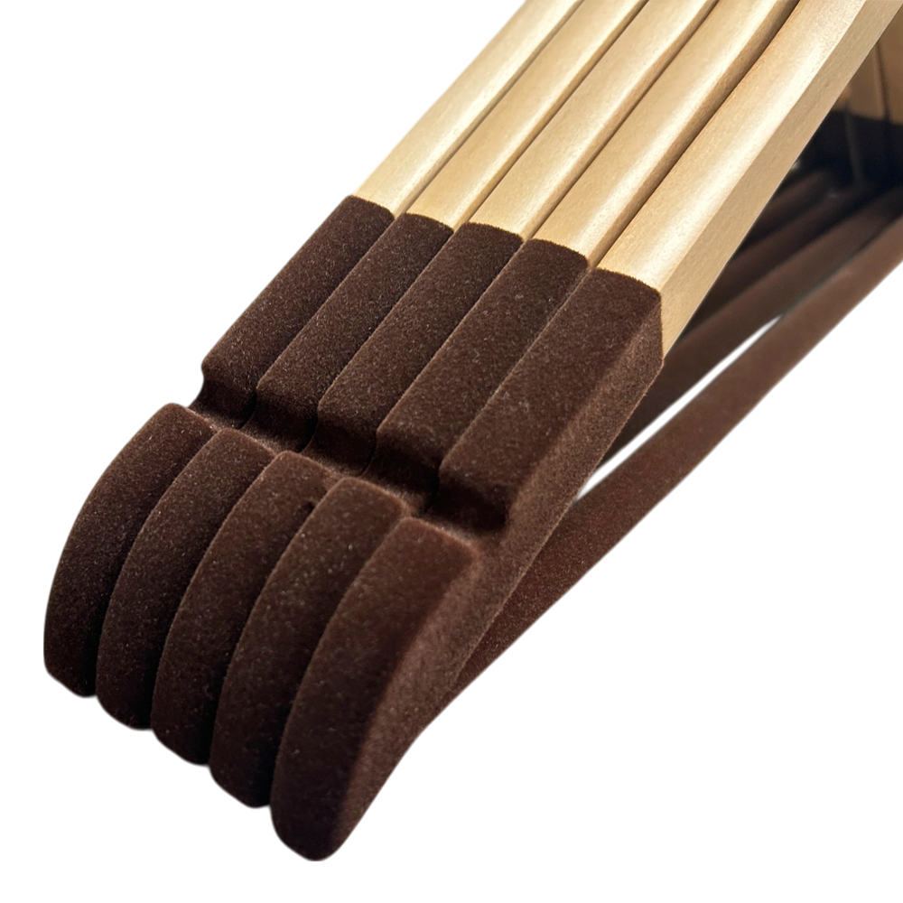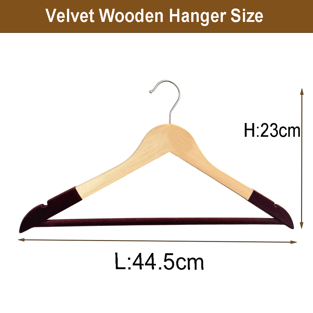 Non-slip Velvet Hanger :These hangers wooden feature velvet coated ends and bars, Soft yet textured, the velvet prevents shirts and pants from slipping.
